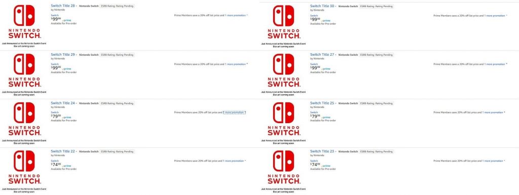 Si visitas la página de Amazon, podrás ver que se han cargado varios juegos al azar, es decir, que no tienen título. Lo único que se sabe es que son de Nintendo Switch. Los precios de estos juegos varían y van de los $59.99 a los $99.99 dólares. Si a esto le sumamos los rumores que apuntan a un nuevo Nintendo Direct en enero, podríamos aventurarnos a decir que, sin duda, habrá una nueva emisión de streaming de parte de Nintendo en el primer mes de 2018.