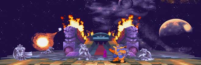 Si bien esto suena atractivo, era el final lo más hermoso de todo. En ese último stage basado en el palacio de Thanos que está en la orilla del universo y construido en tributo hacía la muerte, puedes ver a Drax el Destructor, Thor, Nova y She-Hulk hechos piedra y Lady Death y Mephisto en el fondo “observando” cómo enfrentas a Thanos. En Marvel vs. Capcom Infinite podemos ver el Santuario de Lady Death el cual es muy parecido a este escenario.