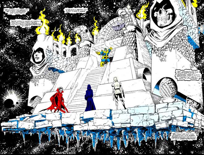 Tanto Quasar como Firelord fracasan en los distintos embates contra el morado eterno de Titán. Después de un fallido intento de Silver Surfer por quitarle el Guantelete, un contingente de Entidades Cósmicas encabezadas por Galactus hace lo propio, pero tampoco logra algo.
