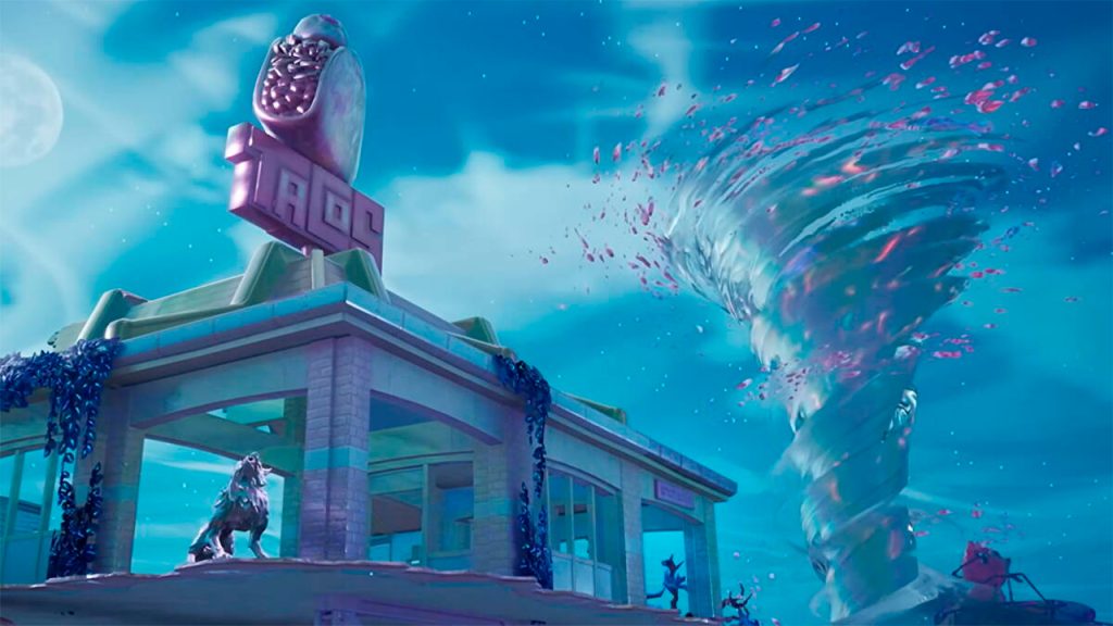Si por alguna razón fallas en tu primer aterrizaje, te recomendamos ir a Tilted Towers y subir al dirigible que está ahí. Desde sus turbinas puedes lanzarte para sacar tu planeador de nuevo. Además, justo enfrente del dirigible está un tablero de contratos en una cafetería. Aterriza ahí, acepta uno y listo.