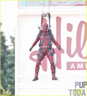 Las fotografías fueron publicadas por Just Jared. En ellas podemos ver al Mercenario Bocazas colgado de un paracaídas que parece estar atorado en un espectacular. Eso sí, Deadpool, nuestro antihéroe favorito cuelga con un estilo digno de Marvel.