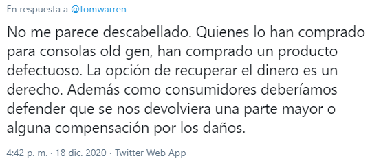 Bajo el argumento de que Microsoft ‘engañó al mundo’ al permitir que Cyberpunk 2077 se vendiera en su plataforma, este usuario considera que debería quedarse con el juego gratis, o al menos eso es lo que señaló a través de Twitter, aunque por el momento su cuenta está suspendida.