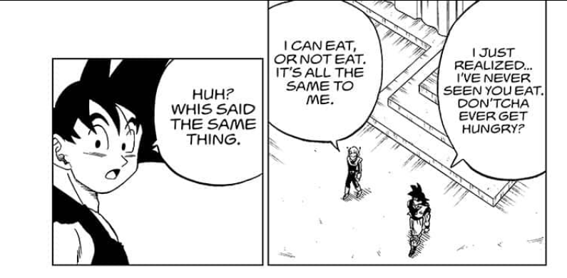 Gokú sabe que ahora tiene más tiempo para entrenar con Merus y, después de comer, le pregunta por qué nunca lo había visto comer a lo que el patrullero responde que a él le da igual comer o no. Son Gokú dijo que había escuchado eso de Whiz, lo cual levanta nuestras sospechas.