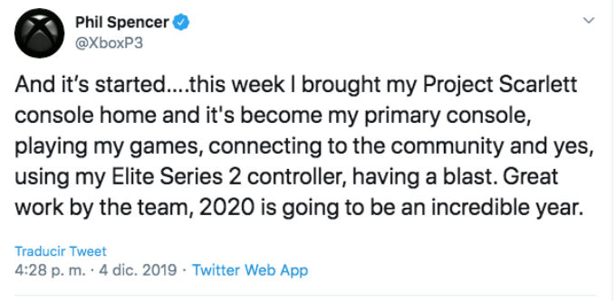 ‘Y comenzó… esta semana me llevé mi consola Project Scarlett a casa y se convirtió mi consola primaria, jugando los juegos, conectándome a la comunidad y sí, usando mi control Elite Series 2, divirtiéndome. Gran trabajo del equipo, 2020 será un año increíble’.